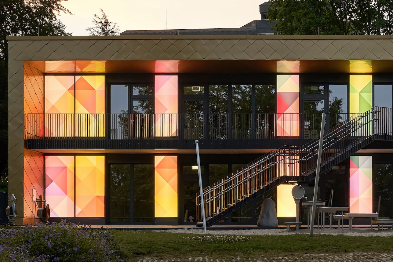 Bei Tag fügt sich die elegante, bunte Glasfassade gut in das ansonsten mit Messing-farbigen Schuppen verkleideten Gebäude ein. Bei Nacht verwandeln die im Rahmen der Panels austauschbar untergebrachten LEDs die Glasflächen in einen echten Hingucker. Gleichzeitig sorgt die LED-Fassade für blendfreie Beleuchtung vor den Eingängen und im Garten.